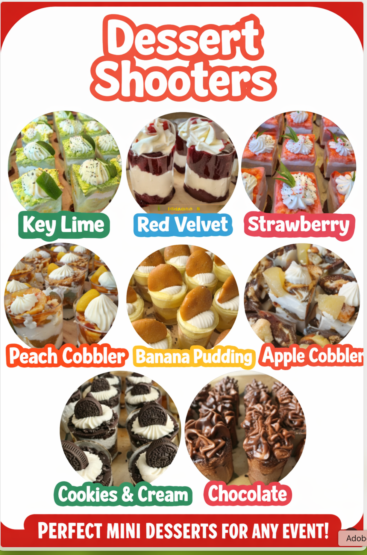 - Dessert Shooters ( Strawberry Cake, Chocolate Cake , Red Velvet Cake , Key Lime Cake, Banana Pudding, Cookies & Cream,